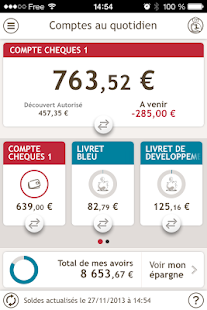- Au premier coup d’œil, retrouvez le solde de vos comptes et vos dernières opérations en temps réel.