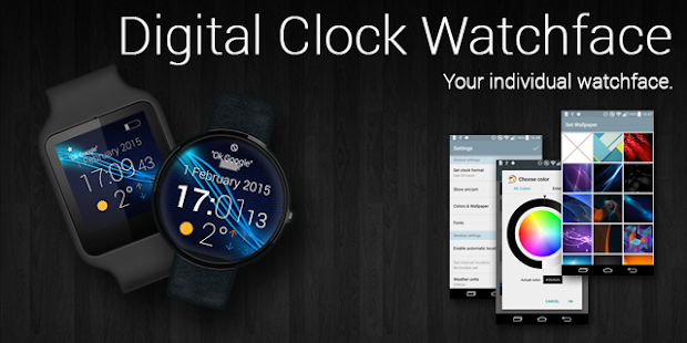 Digital Clock watchface for Android Wear is a digtal clock with weather for the current day (used service is YAHOO Weather), a indicator for the batterie of your smartwatch, a alarm clock indicator (active/inactive of your smartphone).