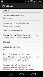 Dislock (formerly Pebble Locker) makes use of the device administrator API to control your lock screen. Enjoy using your Android without a lock screen when your Pebble watch, Android Wear, selected Bluetooth devices or WiFi networks are connected and the security of a lock screen when you walk away, causing your devices or networks to disconnect.
