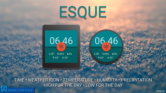 Esque is a free Facepak that will bring weather information to your wrist in a nice Material Design look. See the Temperature, Humidity, Precipitation and the High/Lows at a quick glance. The weather icon and stats change every hour.