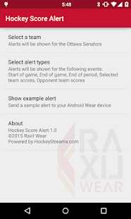 The goal of this app is simplicity and ease of use. Simply install Hockey Score Alert, launch the app on your phone, select your team and that's it. You will automatically receive notifications on your watch when your team is playing.