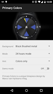 Primary Colors is a refreshingly different take on displaying time. Instead of using numbers and hands this watch face showcases four rotating color wheels. It includes a demonstration mode which will show you how to read the time on this watch face. Try it. Wear it. It will make a great conversation starter and it will make you look very smart. There's a full explanation of how it works at the bottom of this description.