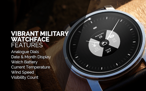 Military watch face is surrounded by a concave dial ring and includes bold printed indices, a printed second’s track, and custom molded hands with luminous features(pro-version) such as Ambient mode, weather, wind speed, Visibility, and date. This watch has been an information tool, giving its wearer some piece of intelligence that he wouldn't have on his own. Perhaps nowhere is that truer or better realized than in the military watch. Frillroid Watch Faces focus is in creating professional looking watch faces. Each Watch Face is engineered by high quality design and required keen concentration to choose the watch colors with soothing effect which ultimately makes the watch unmatchable and incomparable.