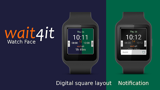 The application contains two watch faces, analog and digital, together with separate layouts for circular and square screens. Optionally you can force using the circular layout on a square screen if you like it more. The progress may be shown as the progress bar or as sliding two-colored background. On the start and end of the period you set the watch will vibrate and display a notification.