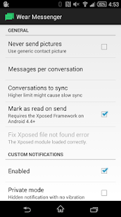 Last but not least, you can link your client's notifications with Wear Messenger's, so whenever you swipe them away on your watch or your phone, they get dismissed on the other part too. Remember to blacklist your SMS client into the Android Wear management app, or you will get double notifications. (Works best on 4.4+, might not be compatible with all clients)