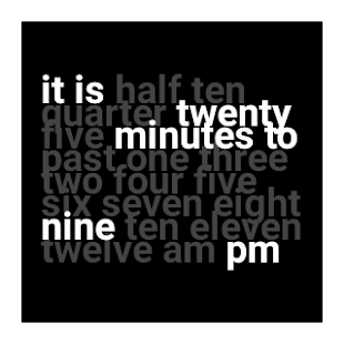This watch face for Android Wear shows the time in text form, in 5-minute steps. If you need minute-level precision, this watch face is not for you. But if you like simplicity and unobtrusive utility, if you're the kind of person who turns off notifications, and if you find the idea of only having a vague sense of the current time appealing, give this watch face a try.