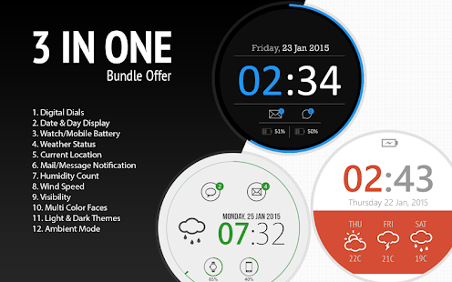 With the Material watch Collection, you can enjoy three different styles of watch faces each with dozens of custom features. Awesome built-in features include ambient mode of all the styles, weather information, Battery status, Humidity level, visibility, date and many more .Frillroid focus is in creating professional looking watch faces. Each Watch Face is engineered by high quality design and required keen concentration to choose the watch colors with soothing effect which ultimately makes the watch unmatchable and incomparable.